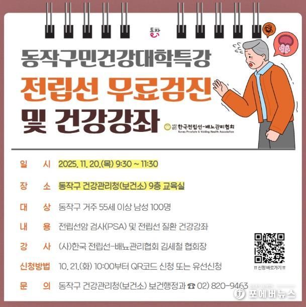 박일하 동작구청장은 “전립선질환은 조기 진단과 꾸준한 관리로 충분히 예방할 수 있는 만큼, 이번 특강이 건강한 노년을 준비하는 작은 출발점이 되길 바란다”라며 “앞으로도 구민의 활력 있는 삶을 위해 실질적인 보건 서비스를 지속적으로 제공하겠다”라고 말했다.