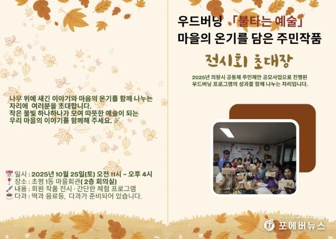 [ 포에버뉴스 김경순 기자 ] 의왕시는 마을공동체 자강불식이 오는 10월 25일 초평1동마을회관(윗새우대북길 14)에서'우드버닝, 불타는 예술'작품전시회를 개최한다고 밝혔다.