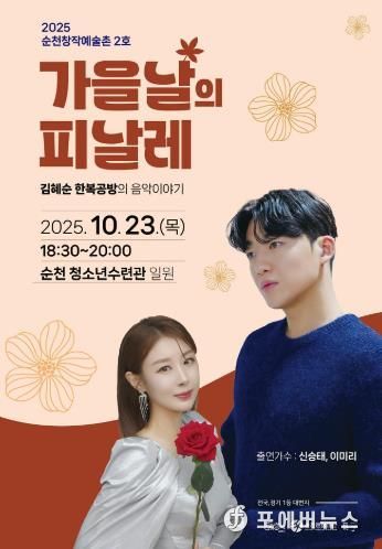 [ 포에버뉴스 오명숙 기자 ] 순천문화재단이 운영 중인 순천창작예술촌 2호 ‘김혜순 한복공방’에서는 오는 23일 오후 7시, 가을 감성을 담은 음악 공연 「가을날의 피날레」(부제: 김혜순 한복공방의 음악 이야기)를 순천시 청소년 수련관 야외무대(순천시 금곡길 20)에서 개최한다고 밝혔다.