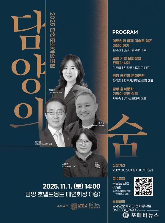 [ 포에버뉴스 오명숙 기자 ] 담양군문화재단은 11월 1일 토요일 오후 2시, 담양 호텔드몽드 대연회장에서 2025 담양 문화예술포럼 '담양의 숨'을 개최한다고 밝혔다.