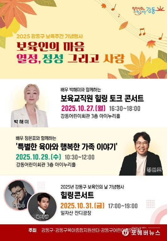이수희 강동구청장은 “이번 보육주간 행사는 보육교직원들이 힐링하고 서로를 응원하는 소통의 장이자, 부모특강을 통해 실질적인 육아 경험을 나누며 부모들의 양육 부담을 덜어주는 뜻깊은 기회”라며, “앞으로도 이러한 프로그램을 확대해 보육 현장과 가정이 함께 성장하고 소통하는 환경을 만들겠다”라고 말했다.
