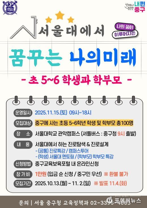 [ 포에버뉴스 김경순 기자 ] 서울 중구가 오는 11월 15일과 22일, 서울대학교 관악캠퍼스에서 관내 초·중학생 및 학부모를 대상으로 하는 '2025 서울대연계 진로심화 프로그램 '꿈꾸는 나의 미래''를 운영한다.