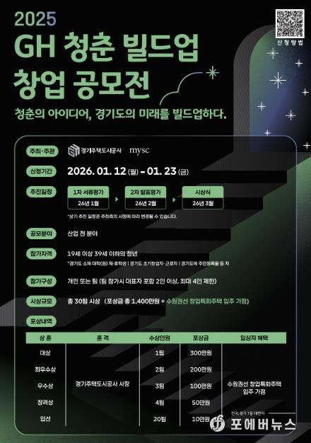 [ 포에버뉴스 김경순 기자 ] 경기주택도시공사(GH)는 ‘청춘의 아이디어, 경기도의 미래를 빌드업하다!’라는 슬로건 아래, 청년들의 참신한 창업 아이디어 발굴을 위한 '2025 GH 청춘 빌드업 창업 공모전'을 24일 공고했다고 밝혔다.