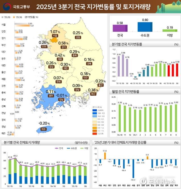 [ 포에버뉴스 사공선 기자 ] 국토교통부와 한국부동산원(원장 손태락)은 '25년 3분기 지가변동률 및 토지거래량을 발표했다.