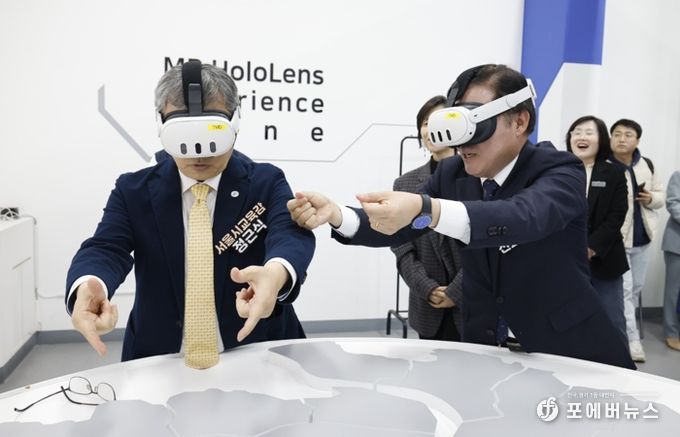 진 구청장은 정근식 서울시교육감과 함께 가상 공간에서 건물과 물건을 자유자재로 배치해 보는 ‘MR(혼합현실) 홀로렌즈’, 드론비행 등을 체험했다.