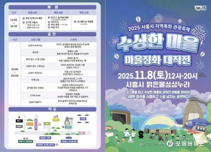 [ 포에버뉴스 김경순 기자 ] 시흥시는 2025년 시흥시 지역특화 관광축제 지원사업 선정 축제인 ‘수상한 마을 마을정화대작전’을 오는 11월 8일 정왕동 맑은물상상누리 일원에서 개최한다. 이번 축제는 시흥시 청년예술연합회가 주관한다.