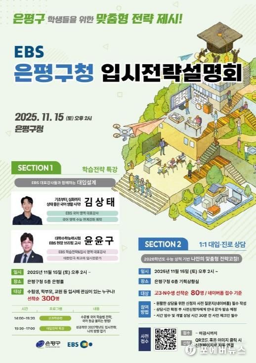특강은 이날 오후 2시부터 5시까지 은평구청 5층 은평홀에서 진행된다. 특강에서는 현재 고2 학생 300명을 대상으로 EBS 대표강사 2명이 수능과 내신 국어 학습전략을 설명하고 2027학년도 대입 지원 전략을 안내한다.