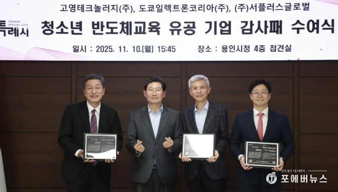 [ 포에버뉴스 김경순 기자 ] 용인특례시는 10일 시청 접견실에서 ㈜서플러스글로벌과 업무협약(MOU)을 체결하고, 지역 청소년 반도체 교육에 기여한 기업 3곳에 감사패를 수여했다고 11일 밝혔다.