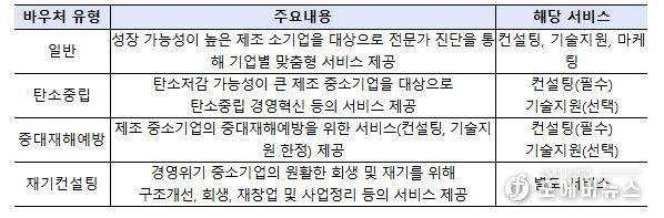 기업의 특성과 필요에 따라 4가지 유형(①일반, ②탄소중립, ③중대재해예방, ④재기컨설팅)으로 구분하며, 유형별로 기업 특성에 맞춘 3개 서비스(컨설팅·기술지원·마케팅)를 바우처 방식으로 지원할 예정이다.