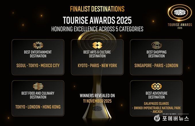 11일, 사우디아라비아의 리야드에서 열린 투어라이즈 시상식에서 5개 분야별 최고의 여행지가 발표됐으며, 서울은 엔터테인먼트 분야 여행 목적지로서 세계 2위에 올랐다.