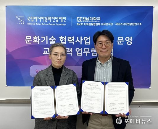 16일 전남대에 따르면 전남대학교 BK21 휴먼케어 지능형 문화예술콘텐츠의 디자인융합인재양성 교육연구단(아트&디자인테크놀로지 협동과정·단장 정정호 교수)과 국립아시아문화전당재단 융합미디어사업단은 지난 11일 문화기술 융합 연구개발 및 창의인재 양성을 위한 업무협약(MOU)을 체결했다.