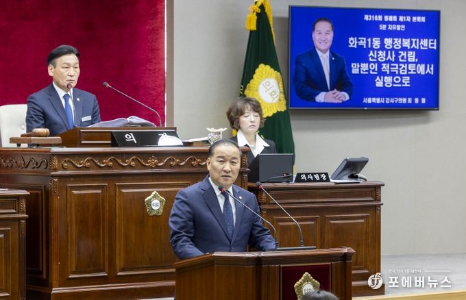 [ 포에버뉴스 김경순 기자 ] 서울 강서구의회 최동철 의원(더불어민주당, 화곡1, 2, 8동)은 제316회 정례회 5분 자유발언을 통해 17년째 표류 중인 화곡1동 행정복지센터 복합 신청사 건립 문제를 지적하며 구청의 책임 있는 추진을 촉구했다.