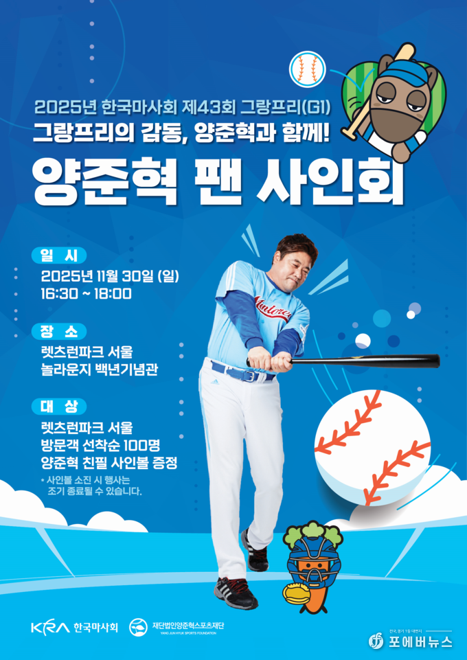 한편, 양준혁스포츠재단은 사회취약계층 청소년 약 160명을 대상으로 무료 야구 훈련, 장비 지원, 문화체험 등을 운영하는 공익법인이다. 한국마사회는 이번 협력을 계기로 ‘스포츠 복지형 사회공헌 모델’을 확대하고, 셀럽이 참여하는 대상경주 마케팅을 정례화할 계획이다.