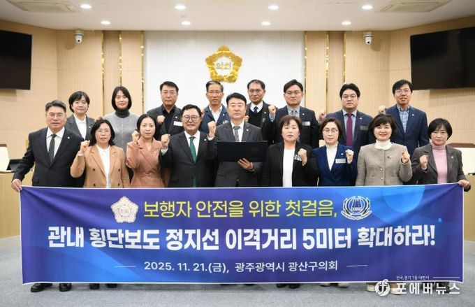 [ 포에버뉴스 오명숙 기자 ] 광산구의회가 21일 제301회 정례회 제1차 본회의에서 ‘횡단보도 정지선 5미터 이격거리 확대 설치 건의안’을 채택했다.