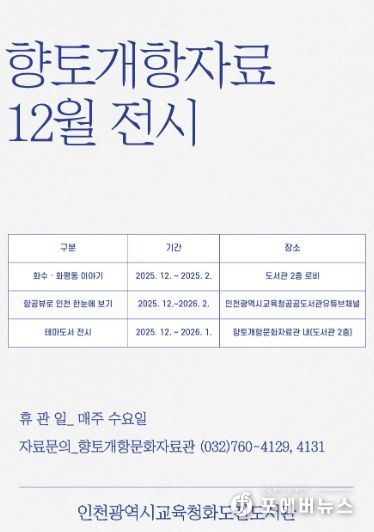 [ 포에버뉴스 김경순 기자 ] 인천광역시교육청화도진도서관은 올해 12월부터 2026년 1월까지 지역문화와 향토자료를 주제로 전시 프로그램을 운영한다.