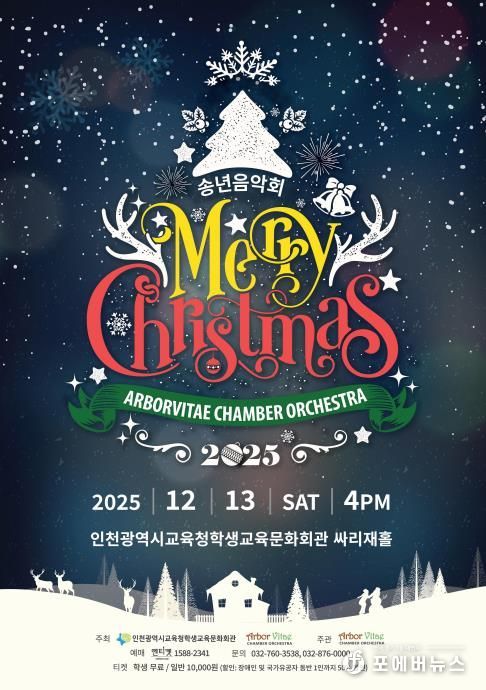 [ 포에버뉴스 김경순 기자 ] 인천광역시교육청학생교육문화회관은 12월 13일 오후 4시 대공연장 싸리재홀에서 ‘송년음악회 Merry Christmas’를 개최한다.