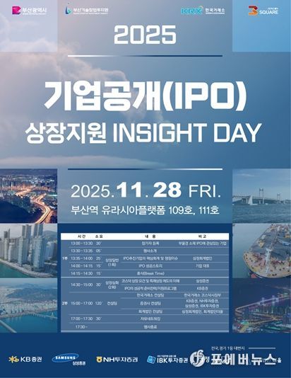 [ 포에버뉴스 사공선 기자 ] 부산시와 부산기술창업투자원은 한국거래소와 함께 28일 오후 1시 부산역 유라시아플랫폼에서 지역에서 처음으로 '2025년 기업공개(IPO, Initial Public Offering) 상장 지원 인사이트 데이(INSIGHT DAY)'를 개최한다고 밝혔다.