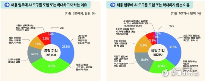 향후 채용 업무에 AI 도구를 도입·확대할 계획이 있는 기업은 74.5%(295개사)로 이들은 ‘AI 기반 인적성 또는 역량검사’(67.5%), ‘지원서류 검토’(63.4%), ‘채용 절차 관리’(55.6%) 등에 AI를 활용하겠다고 응답했다.