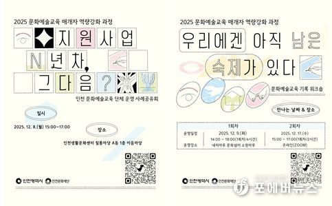 [ 포에버뉴스 김경순 기자 ] 인천광역시와 (재)인천문화재단은 인천 지역에서 활동하는 문화예술교육 매개자의 전문성 향상과 지속가능한 활동 기반을 위해 '2025 문화예술교육 매개자 역량강화 과정'을 오는 12월 8일부터 17일까지 운영한다.