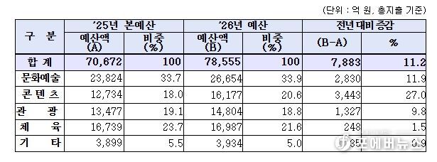 [ 포에버뉴스 김경순 기자 ] 문화체육관광부는 2026년도 문체부 예산이 7조 8,555억 원으로 최종 확정되었다고 밝혔다. 이는 올해 본예산 대비 7,883억 원(11.2%)이 증가한 규모이다. 문체부는 이번 예산을 ‘케이-컬처’ 300조 원 시대 출발을 위한 예산으로 콘텐츠산업의 국가전략산업화, 국민이 함께 누리는 관광 등에 주력해 편성했다고 밝힌 바 있다.