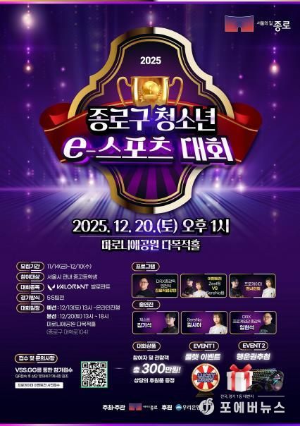 [ 포에버뉴스 김경순 기자 ] 종로구는 12월 20일 13시 마로니에공원 다목적홀(대학로 104)에서 '2025 종로구 청소년 e스포츠 대회'를 개최한다.