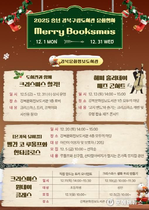[ 포에버뉴스 김경순 기자 ] 서울 강북구는 강북구립도서관이 송년의 달과 크리스마스 시즌을 맞아 ‘2025년 강북구립도서관 송년의 달 기념 행사 Merry Booksmas(메리 북스마스)’를 운영한다고 밝혔다.