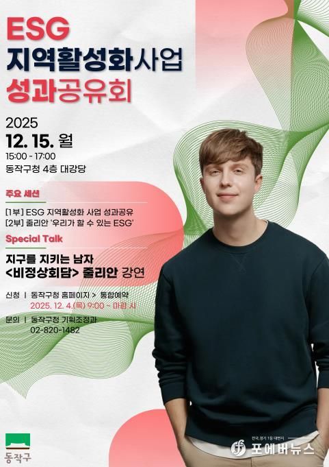 [ 포에버뉴스 김경순 기자 ] 동작구가 오는 15일 오후 3시 구청 4층 대강당에서 ‘ESG 지역활성화사업 성과공유회’를 개최한다고 밝혔다.