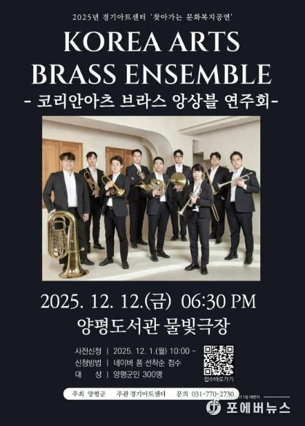 [ 포에버뉴스 박정배 기자 ] 양평군은 지역 주민에게 품격 있는 문화 향유 기회를 제공하고자 오는 12월 12일 양평도서관 물빛극장에서 ‘연말 맞이 찾아가는 문화복지 공연’을 개최한다고 밝혔다.