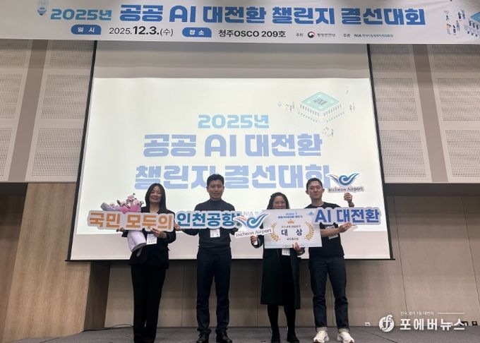 [ 포에버뉴스 김경순 기자 ] 인천국제공항공사는 지난 3일 청주 오스코에서 열린 ‘2025년 공공 AI대전환 챌린지 우수사례 왕중왕전’에서 대상(국무총리상)을 수상했다고 4일 밝혔다.