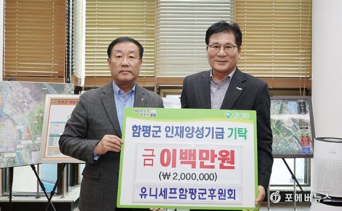 함평군은 5일 “유니세프함평군후원회가 지난 4일 군 인재양성기금에 200만 원을 기탁했다”고 밝혔다.