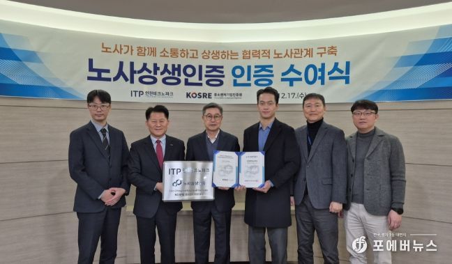 인증서는 17일 엄진엽 KOSRE 원장이 인천TP에 방문해 이주호 원장과 김정형 근로자 대표에게 직접 전달했다.