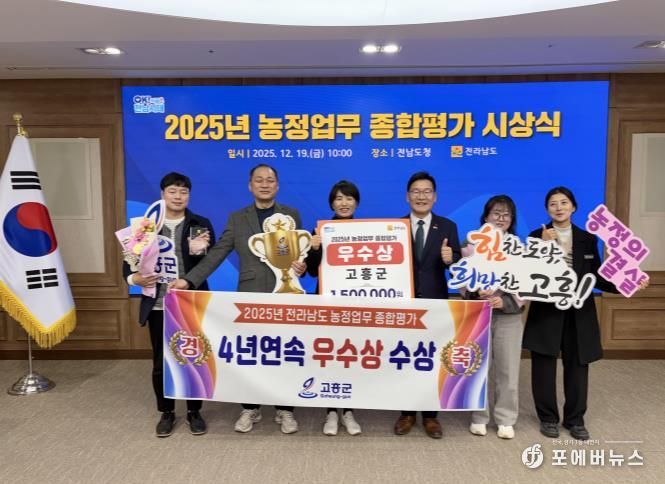 [ 포에버뉴스 오명숙 기자 ] 고흥군이 전라남도가 주관한 ‘2025년 농정업무 종합평가’에서 4년 연속 ‘우수상’을 수상하며, 농업 강군(强郡)으로서의 위상을 다시 한번 입증했다.