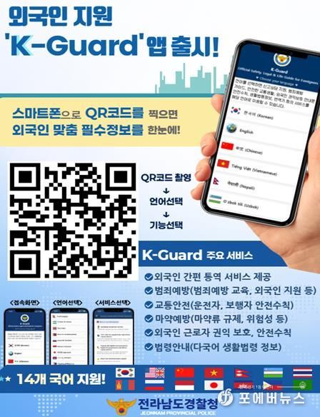 [ 포에버뉴스 오명숙 기자 ] 전남경찰청은 국내 체류 외국인의 범죄·사고 예방과 인권이 존중받는 사회를 위해 외국인 맞춤형 통합 정보제공 앱『K-Guard』를 개발하고, 12월 22일부터 시범운영에 들어간다고 밝혔다.