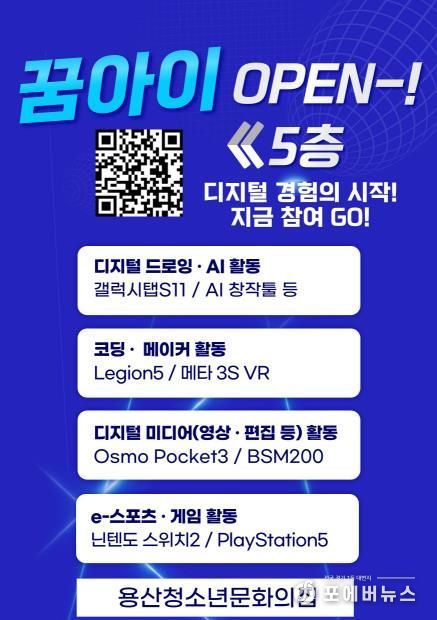 [ 포에버뉴스 김경순 기자 ] 서울 용산구는 인공지능(AI)과 디지털 시대를 선도할 미래 인재를 양성하기 위해, 용산꿈나무종합타운(백범로 329) 내 청소년 전용 디지털 공간인 ‘꿈아이 인공지능(AI) 디지털체험실’을 조성하고, 12월부터 시범운영을 시작했다고 밝혔다.