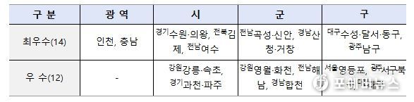 종합점수 산정결과, 인천, 충남 등 광역 지자체 2곳, 경기 수원, 전남 곡성, 대구 수성 등 기초 지자체 24곳 등 총 26곳이 우수 지방정부로 선정됐다.