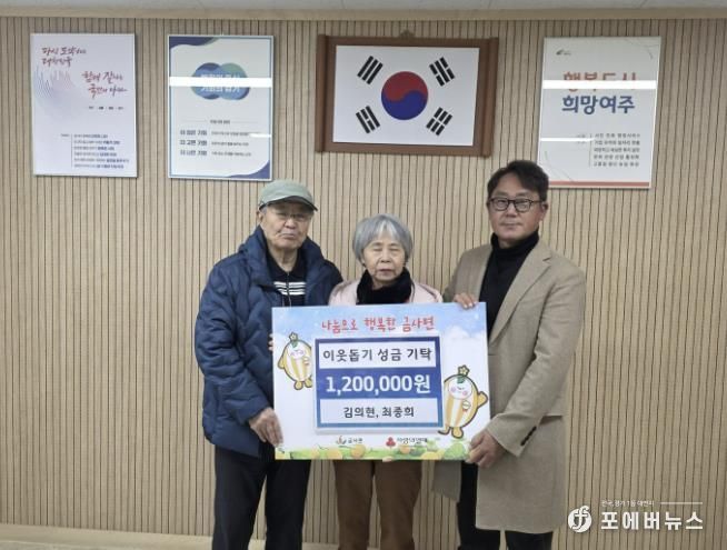 [ 포에버뉴스 박정배 기자 ] 금사면 생활개선회 최종희 회장이 배우자와 함께 지난 24일 여주시 금사면행정복지센터를 방문하여 이웃돕기 성금 120만원을 기탁했다.