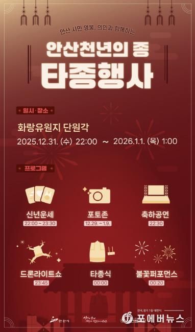 [ 포에버뉴스 김경순 기자 ] 안산시는 오는 31일 오후 10시부터 화랑유원지 단원각에서 ‘2026 안산 천년의 종 타종 행사’를 개최한다고 30일 밝혔다.