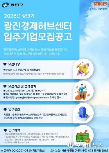 신청 기간은 2026년 1월 26일까지다. 광진구청 또는 엔슬파트너스 누리집에 게시된 서식에 따라 제출 서류를 준비해 이메일(gwangjinbi@enslpartners.com)로 접수하면 된다. 구는 기술성, 시장성, 사업성 등에 대한 평가와 심사를 거쳐 입주기업을 최종 선정하고 개별 안내할 예정이다. 자세한 사항은 광진경제허브센터 기업지원실(02-2201-9541)로 문의하면 된다.
