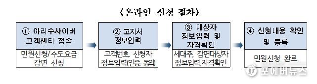 신청방법은 방문신청 또는 온라인신청이 가능하다. 방문 신청은 1월 12일부터 감면받을 주소지 관할 동주민센터에서 우선 접수하며, 온라인 신청은 3월 3일부터 서울아리수본부 누리집 내 아리수 사이버고객센터에서 할 수 있다.