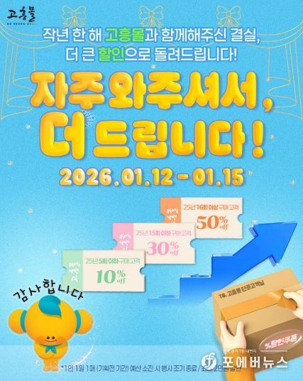 이번 기획전은 2025년 연간 최대 매출 달성을 기념하고, 그 성과에 기여한 구매 고객에게 감사의 뜻을 전하기 위해 마련됐다. 2025년 한 해 고흥몰 주문 횟수를 기준으로 고객별 차등 할인 혜택을 제공하는 것이 특징으로, 고흥몰을 꾸준히 이용해 온 단골 고객일수록 더 큰 혜택을 받을 수 있도록 설계된 고객 감사형 프로모션이다.