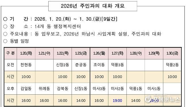 [ 포에버뉴스 김경순 기자 ] 하남시는 오는 1월 20일부터 30일까지 관내 각 동 행정복지센터를 순회하며 ‘2026년 주민과의 대화’를 개최한다고 밝혔다.
