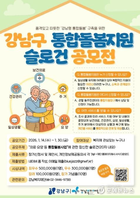 1월 14일부터 30일까지 진행되는 이번 공모에서는 강남형 통합돌봄의 가치와 방향을 담은 간결하고 기억하기 쉬운 문구(20자 이내)를 모집한다. 문구에는 통합돌봄의 핵심 가치인 존엄, 연대, 자립, 지역사회, 포용 등의 내용을 포함해야 한다. 강남복지재단 홈페이지에서 참가신청서, 제안서, 개인정보수집·이용동의서 서식을 내려받아 작성 후 이메일로 제출하거나 포스터의 QR코드를 통해 네이버폼으로 제출하면 된다.