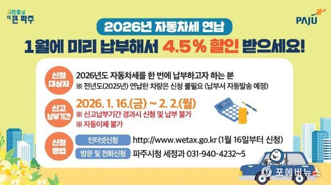 [ 포에버뉴스 김경순 기자 ] 파주시는 2026년도 자동차세를 1월에 한 번에 납부하는 경우 세액공제 혜택을 받을 수 있는 자동차세 연납 신청·납부를 2월 2일까지 접수한다고 밝혔다.
