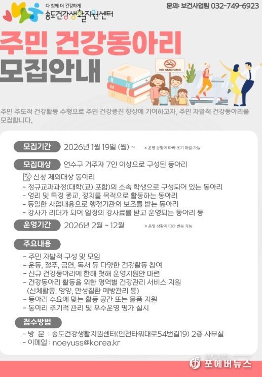 [ 포에버뉴스 김경순 기자 ] 연수구 송도건강생활지원센터는 주민들의 자발적인 건강 증진 활동을 지원하기 위해 오는 19일부터 ‘주민 참여형 건강동아리’를 모집한다.