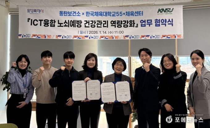 [ 포에버뉴스 김경순 기자 ] 화성시동탄보건소는 14일 한국체육대학교 학교기업 55+체육센터와 ‘인공지능(AI)·사물인터넷(IoT) 기반 어르신 건강관리사업과 연계한 노쇠 예방 및 신체활동 증진 프로그램 추진을 위한 업무협약’을 체결했다.