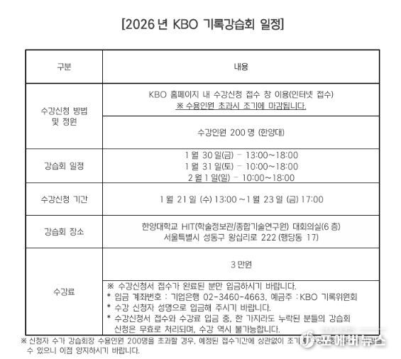 [ 포에버뉴스 사공선 기자 ] 2026년 KBO 기록강습회가 1월 30일(금)부터 2월 1일(일)까지 서울 한양대학교에서 개최된다. 기록강습회는 야구 공식기록법의 보급과 이해를 통한 저변 확대를 목적으로 프로야구 원년인 1982년부터 개최됐다.