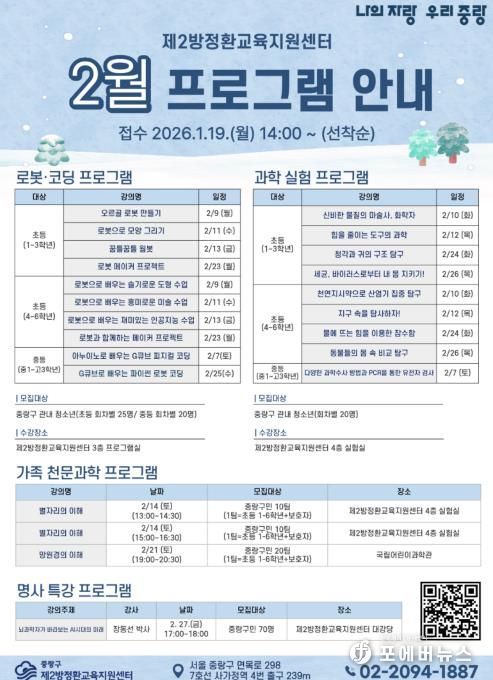2월 겨울방학 특강은 로봇·코딩 프로그램과 과학 실험 프로그램을 중심으로 운영되며, 가족이 함께 참여하는 천문과학 프로그램을 포함해 구성됐다. 특히 천문과학 프로그램은 국립어린이과학관을 방문해 가족이 함께 전시와 체험 활동에 참여하는 방식으로 운영돼, 보다 생생한 과학 학습 경험을 제공할 예정이다. 2월 프로그램은 1월 19일부터 제2방정환교육지원센터 누리집을 통해 온라인 선착순 접수를 진행한다.