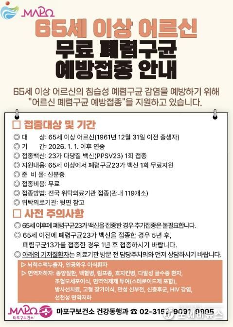 박강수 마포구청장은 “폐렴구균 감염은 면역력이 저하된 고령층에서 중증으로 이어지기 쉬운 만큼 65세 이상 어르신에게 예방접종이 꼭 필요하다”라며, “대상 어르신들께서는 가까운 의료기관을 통해 무료 접종을 받으시고 건강한 일상을 이어가시길 바란다”라고 말했다.