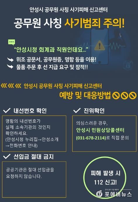 안성시 관계자는 “안성시 공무원은 어떠한 경우에도 선입금을 요구하지 않는다”며 “수상하거나 의심스러운 연락을 받았을 경우, 즉시 신고센터로 문의해 달라”고 당부했다.
