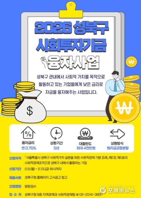 [ 포에버뉴스 김경순 기자 ] 서울 성북구가 ‘2026년 상반기 사회투자기금 융자 지원 사업’을 실시한다. 경제적 어려움을 겪는 관내 사회적경제 조직의 안정적인 운영을 돕기 위해서다.